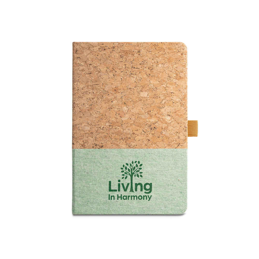 Taccuino A5 con copertina rigida in sughero e lino nella parte inferiore.
