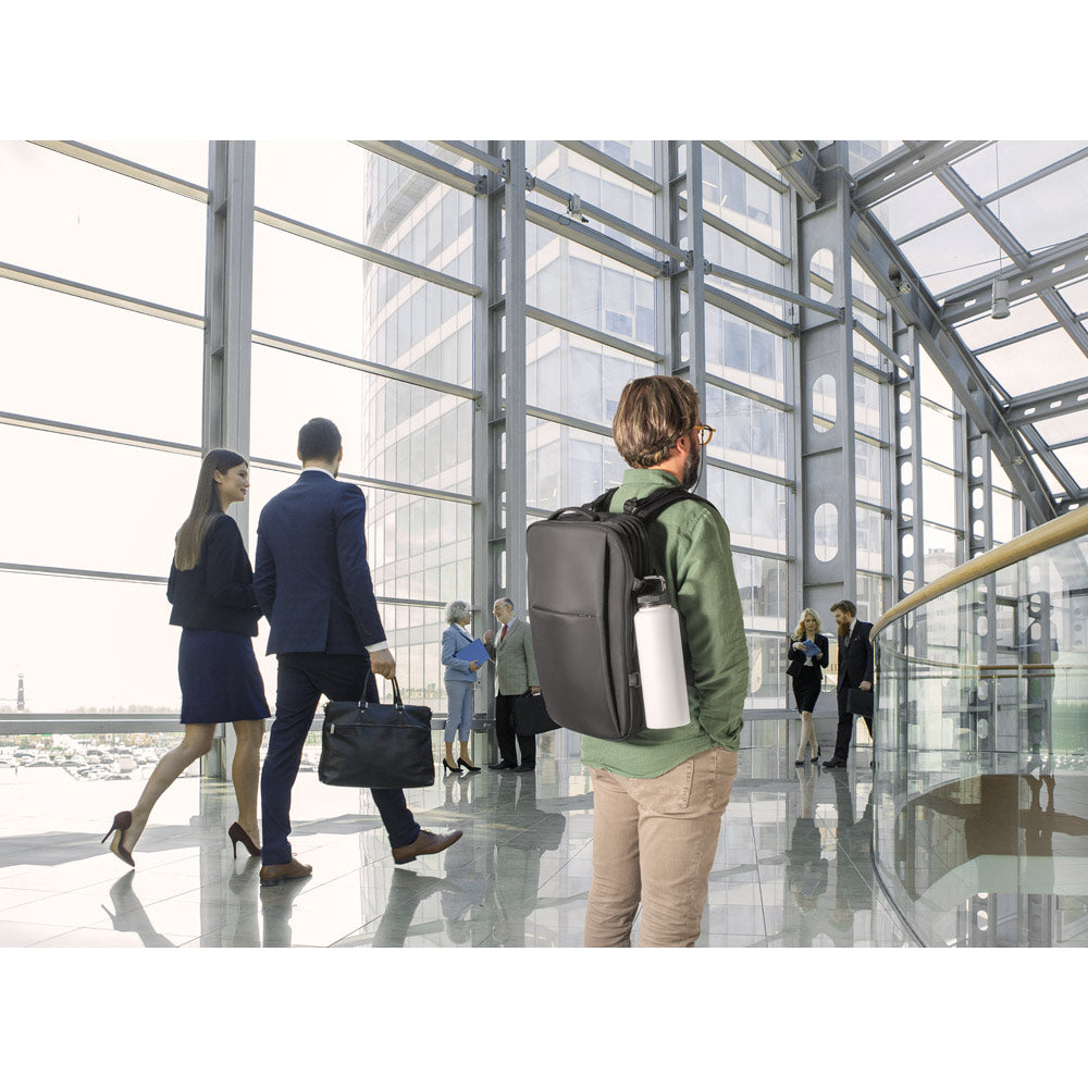 Dispone di 3 scomparti principali con fodera in poliestere riciclato 210D: uno scomparto posteriore imbottito con tasca per laptop fino a 17,3" e tasca per tablet fino a 10,1", uno scomparto centrale espandibile con cerniera perfetto per riporre i vestiti, e uno scomparto anteriore organizzato con diverse tasche interne.