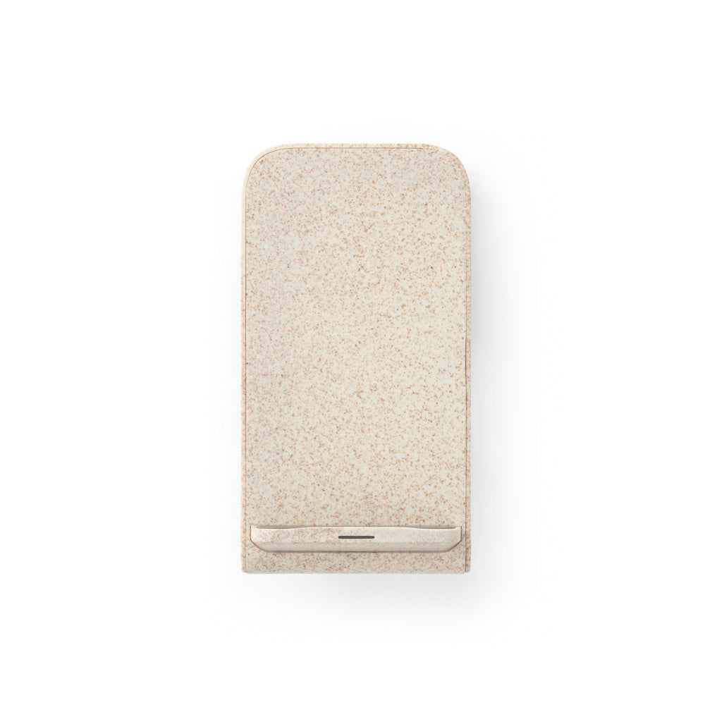 Supporto per smartphone in fibra di paglia e ABS riciclato (100% rABS) con caricatore wireless doppio da 10W.