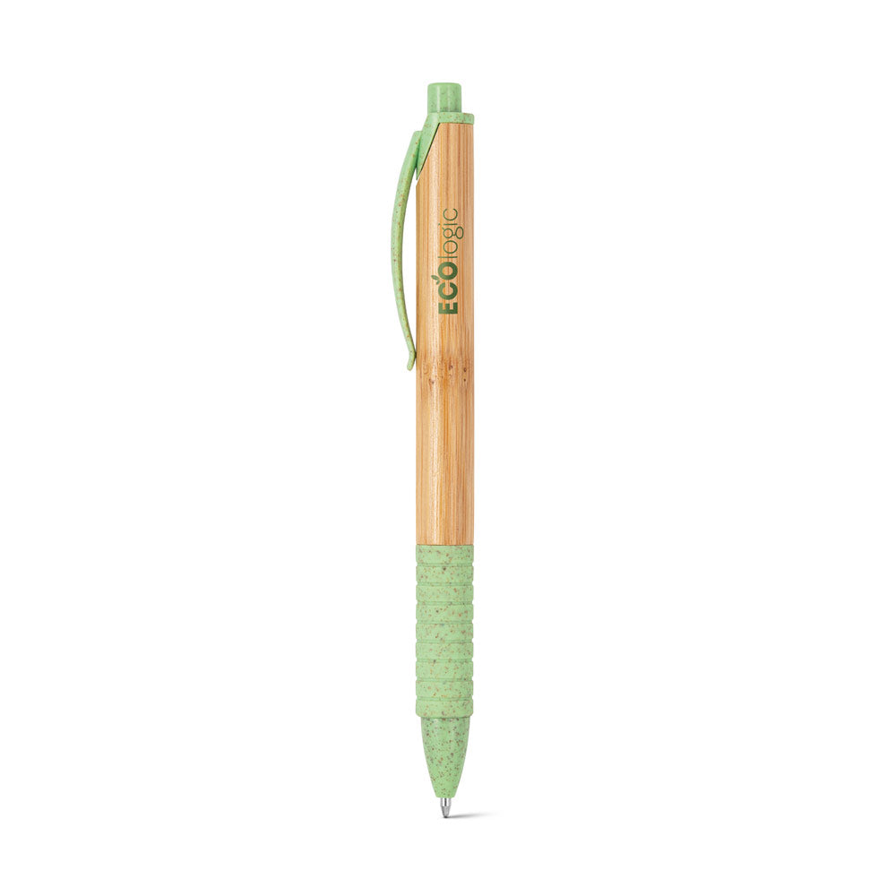 La penna a sfera KUMA è realizzata in bambù naturale, arricchita da una clip con gomma antiscivolo ed elementi colorati in fibra di grano e ABS.