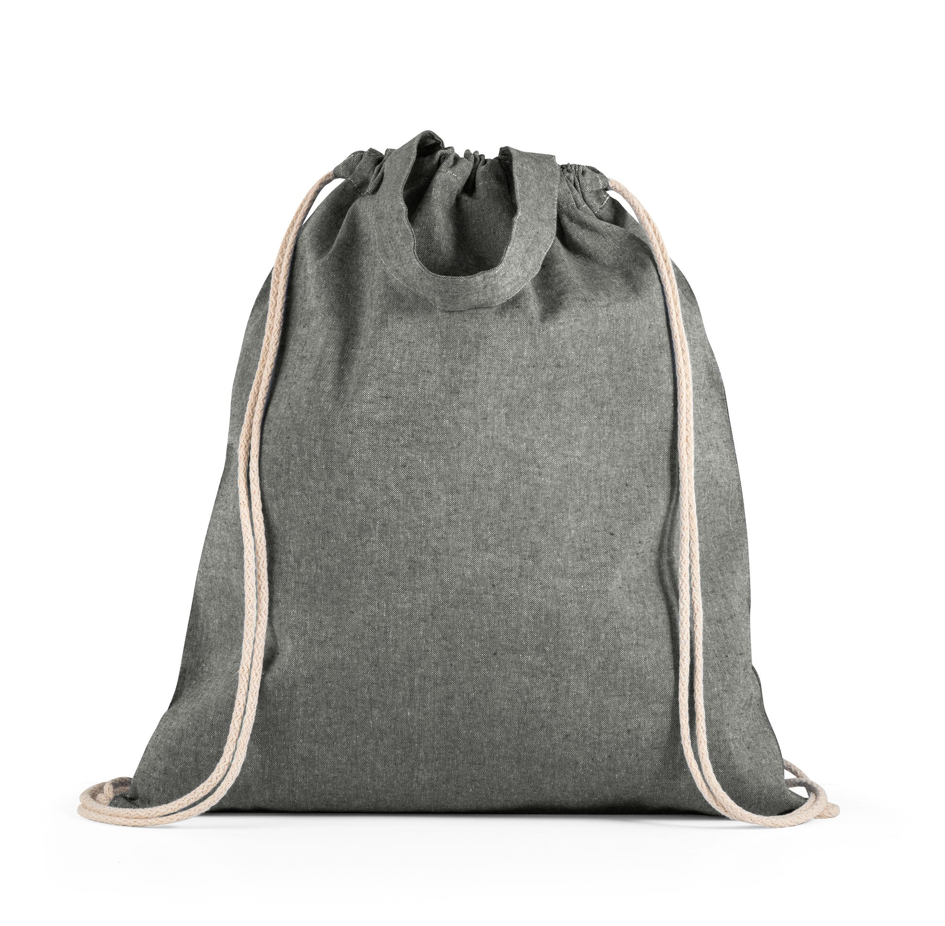Lo zaino a sacca RISSANI è realizzato in cotone riciclato (70%) e poliestere rPET (30%) (140 g/m²), una scelta sostenibile e resistente per l’uso quotidiano.